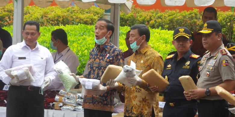 SAHABAT CABE -- Presiden Joko Widodo mengikuti proses pemusnahan barang bukti narkotika yang berhasil diungkap Badan Narkotika Nasional. Dalam kesempatan tersebut Presiden Jokowi juga membuang 2 bungkus Sabu dan Ganja ke dalam mesin Inseminator.